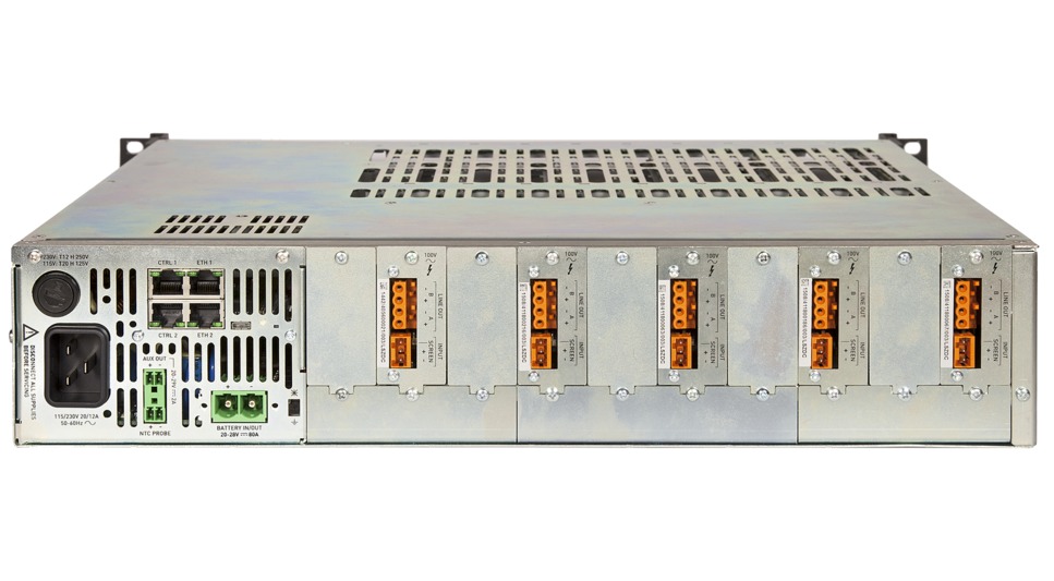 Le châssis V2000 est conçu pour être alimenté soit par le secteur (230V, 50/60Hz AC), soit par une alimentation de secours en 24V DC. Un chargeur certifié EN54-4 intégré à l’intérieur du châssis provisionne suffisamment de courant pour charger la batterie du système et opérer jusqu’à sa puissance maximale de 2000 W, tout en alimentant un routeur VIPEDIA-12. En cas de perte de l’alimentation 230V, le châssis commute automatiquement sur les batteries, tout en maintenant la même puissance d’amplification, évitant ainsi l’utilisation d’un chargeur externe.